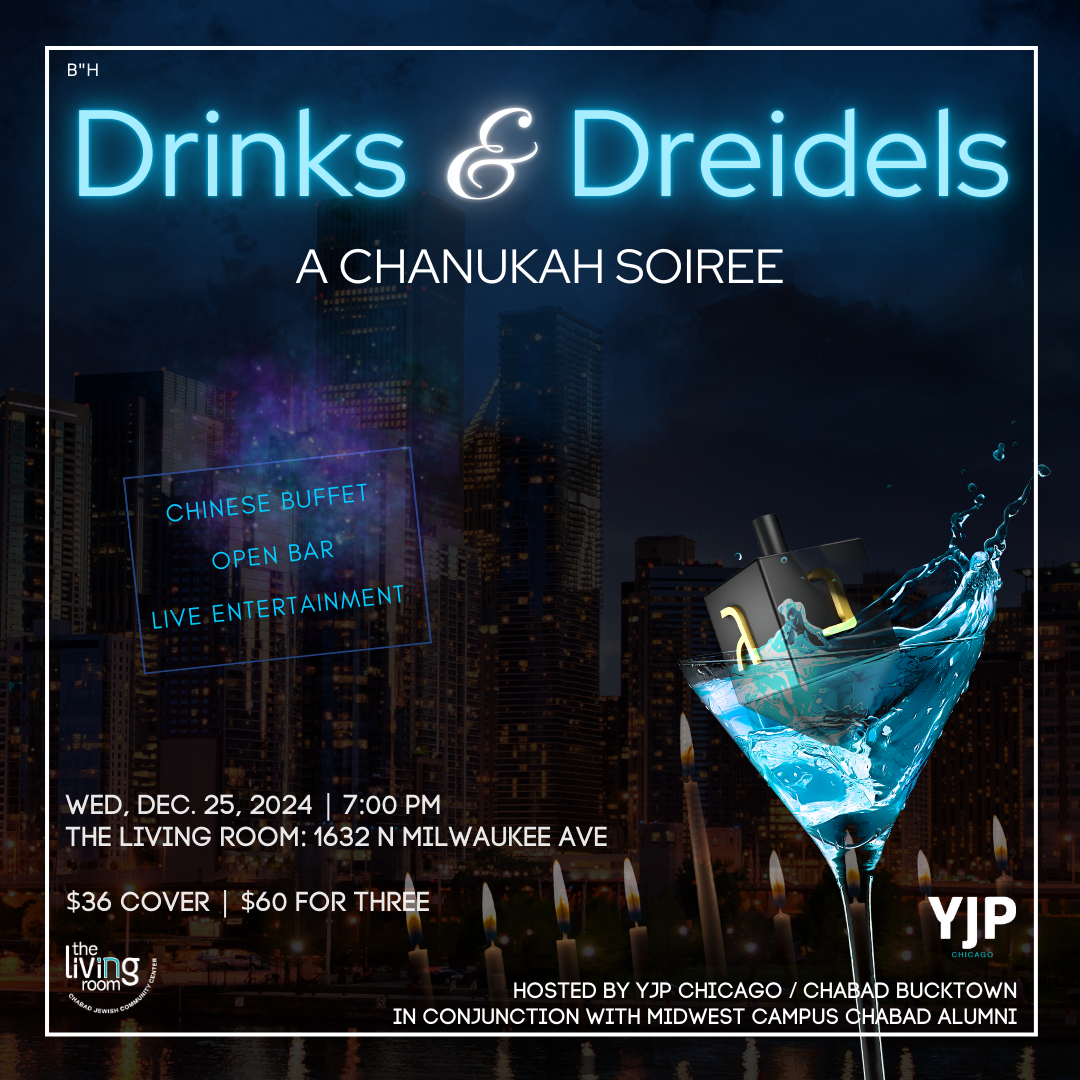Join us for Drinks and Dreidels: A Chanukah Soiree! Wednesday, December. 25, 2024 | 7:00 pm at The living room: 1632 N, Milwaukee Ave.